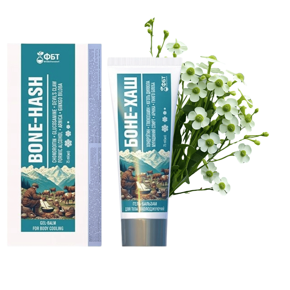 INCI: Aqua, Glycerin, Paraffinum Liquidum, Alcohol, Carbomer, Triethanolamine, Sodium Chondroitin Sulfate, Glucosamine HCL, Formic Acid, Harpagophytum Procumbens Root Extract, Humulus Lupulus Extract, Urtica Dioica Leaf Extract, Arnica Montana Flower Extract, Brassica Oleracea Capitata Leaf Extract, Ginkgo Biloba Leaf Extract, Camphor, Hydrolyzed Collagen, Menthol, Xanthan Gum, Sodium Benzoate, Phenoxyethanol, Benzoic Acid, Caprylyl Glycol. Детальніше: https://fitomarket.com.ua/gel-balzam-dlja-tela-ohlazhdajushhij-bone-hash-75-ml
